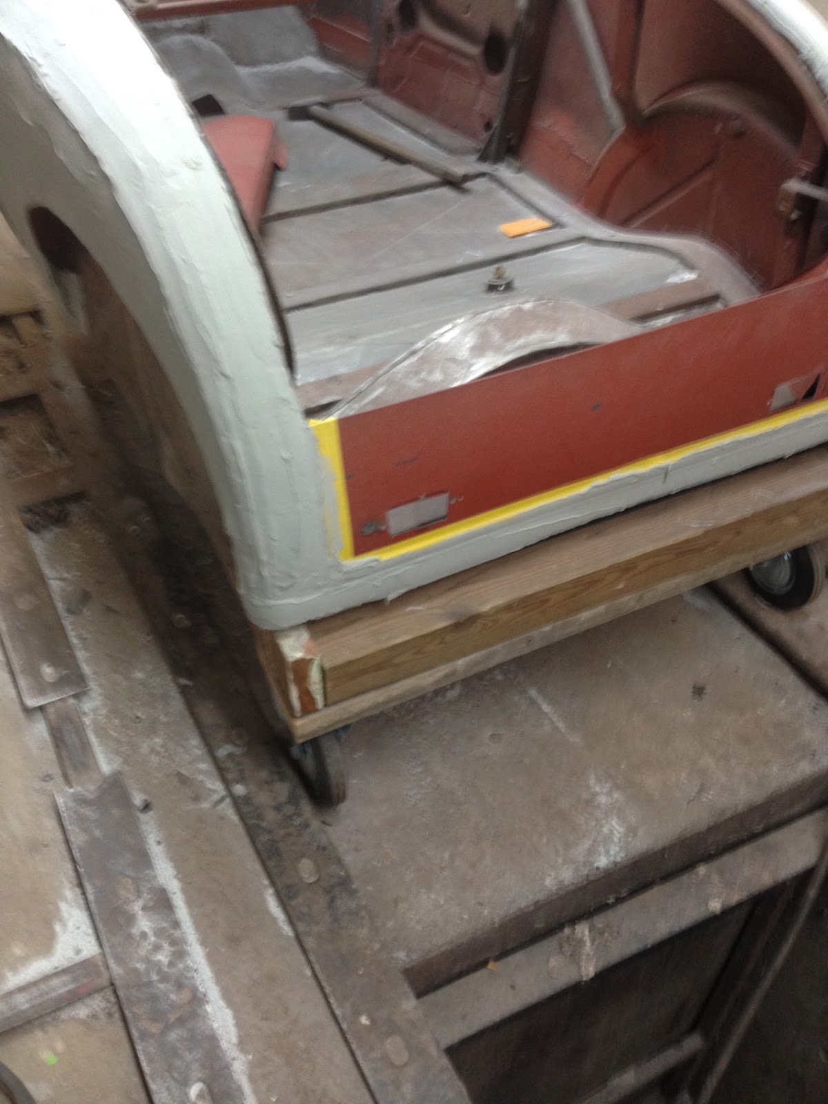 I received a 1931 Model T Roadster on November 2nd, 2015. It came in on a tow truck mounted to a wooden-box dolly for easy maneuver around. Stephen and I started by wire-brushing the entire body to knock off the rust. Then next Stephen and I took the grinder to it all over the entire Roadster. Then we applied 2- 1/2 gallons of bondo on the entire body as owner requested. Next, Ron molded the bondo to the groves in the body, grill, front hood and the deck lid. After working and shaving the bondo to draw lines in the Roadster body, Ron began prepping it to be put into primed next in black primer inside and out the Roadster body.